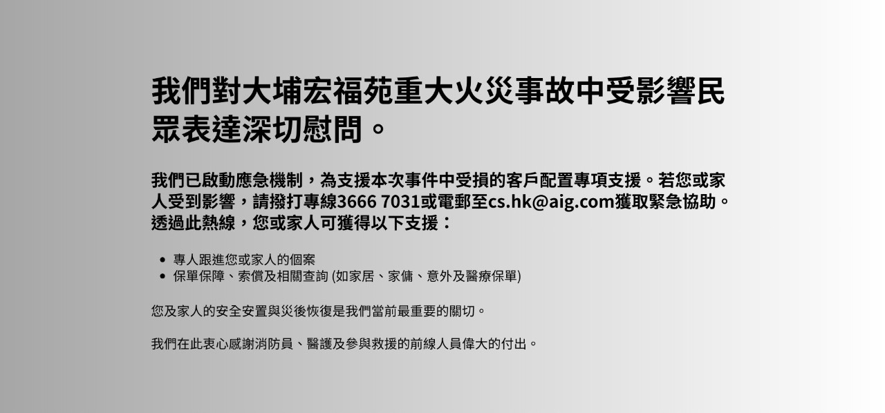 敬請留意: 美亞香港保險有限公司提醒客戶及公眾提高警惕,謹防詐騙。本公司僅通過以下方式與客戶聯繫:電話短信:所有簡訊均來自發件人 #AIGHK 電郵:所有電郵均來自域名地址 ……@aig.com 電話:所有來電均會進行身份驗證流程,本公司不會透過以上途徑向客戶索取銀行或信用卡資料、PIN碼或密碼。請保持警覺,切勿向不明人士透露個人資料或銀行帳戶信息。如您因可疑來電或短信(聲稱來自美亞保險香港有限公司或其合作夥伴)而提供了個人或敏感資訊,或進行了轉帳,請立即向警方報案,並透過以下方式通知我們:電郵:cs.hk@aig.com / 電話: +852 3666 7017